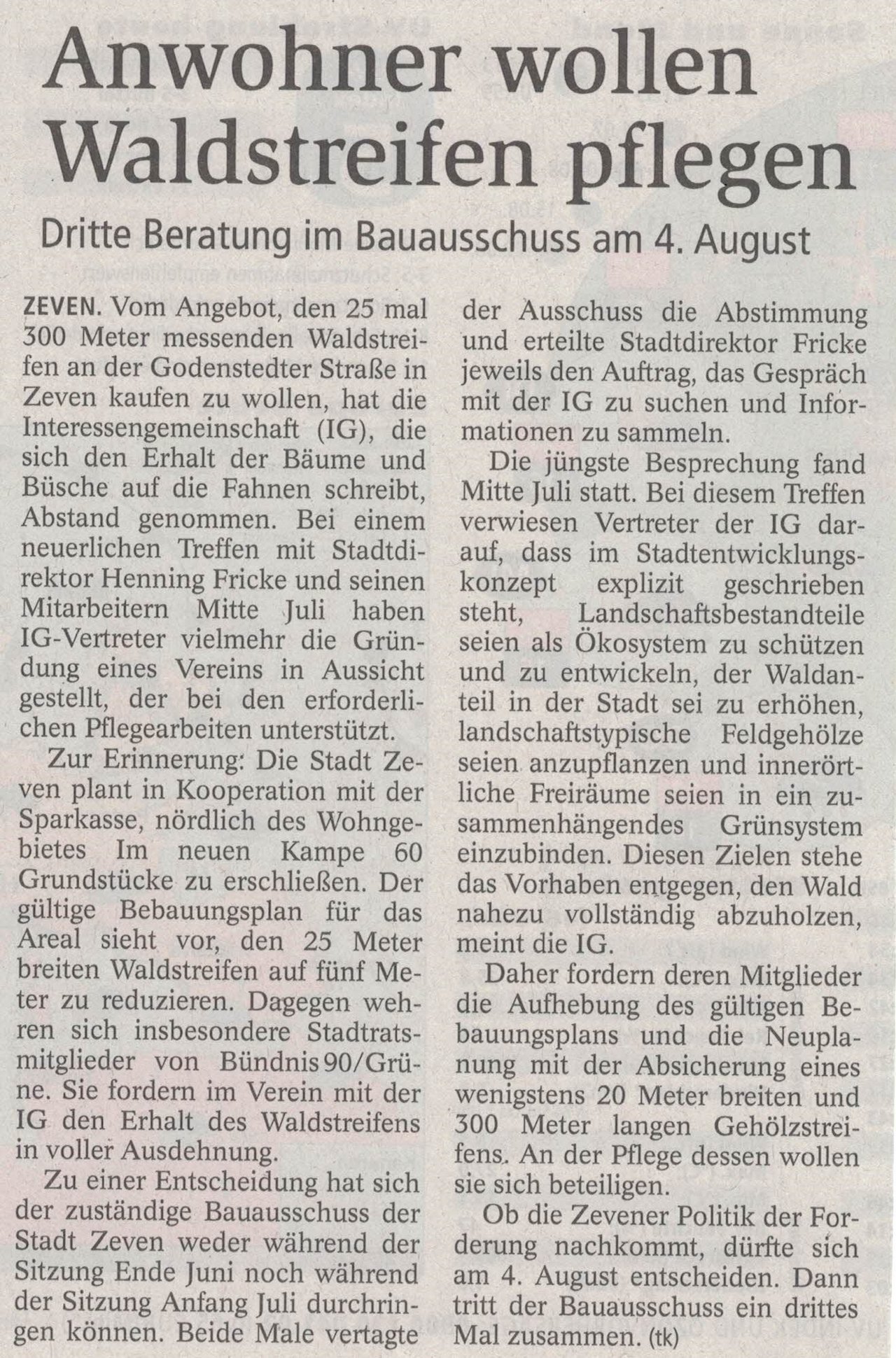 Eine Interessengemeinschaft der Anwohner hat darüber hinaus mittlerweile signalisiert, den Waldstreifen zu kaufen und zu pflegen, dazu haben wir einen zusätzlichen Antrag gestellt.