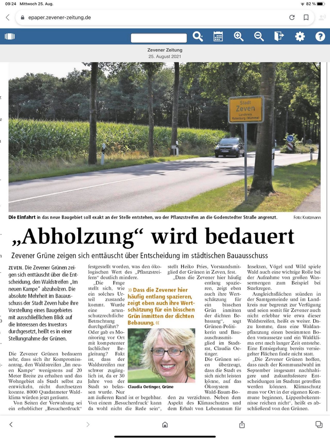 4. Es kann nicht sein, dass die Bundesregierung ein 8-Milliarden-Programm für Klimaschutz verabschiedet und in Zeven fällt ein Baum nach dem anderen. Alle Parteien haben sich den Klimaschutz auf die Fahnen geschrieben, jetzt wird es Zeit dieses Versprechen einzulösen nach dem Grundsatz „Global denken, lokal handeln“."